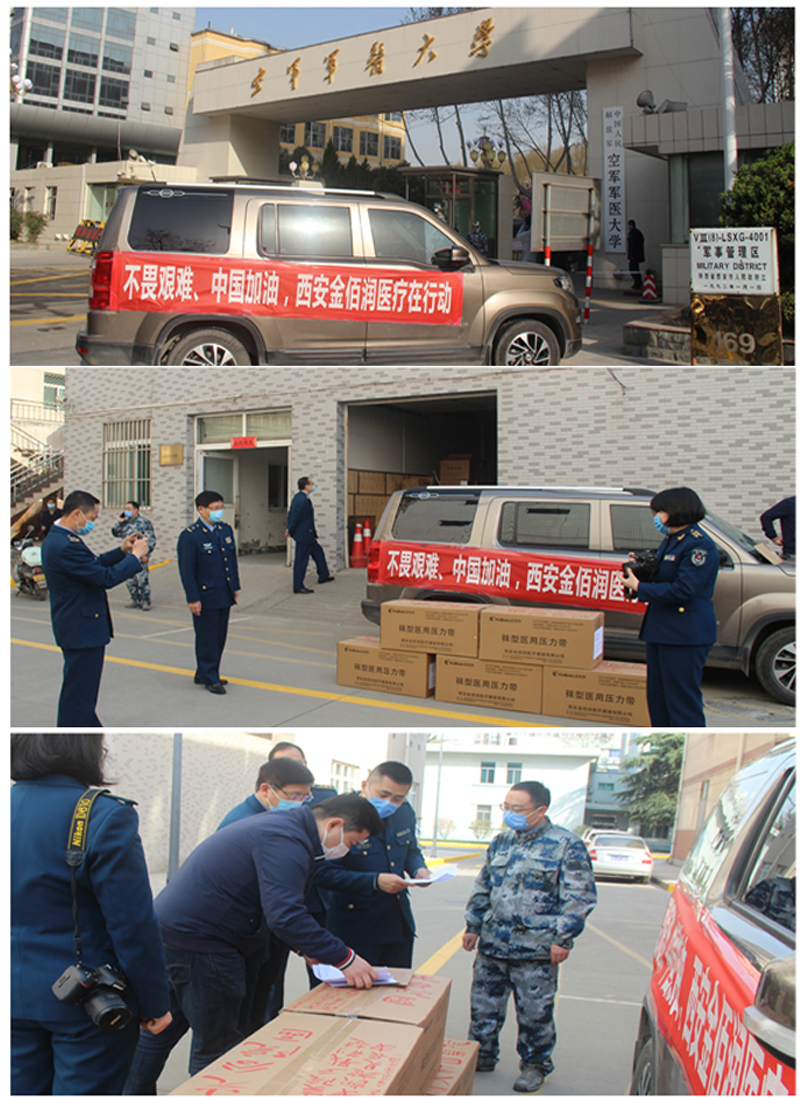 在緊急召開視頻會議后,公司管理小組一致同意為抗擊疫情的醫(yī)護(hù)人員捐贈襪型醫(yī)用壓力帶,在經(jīng)過緊張的聯(lián)系、籌備和生產(chǎn)后,2020年3月19日,西安金佰潤醫(yī)療器械有限公司醫(yī)療物資捐贈儀式順利舉行。此次捐贈物資主要用于駐扎在武漢火神山醫(yī)院和光谷醫(yī)院的空軍軍醫(yī)大學(xué)援鄂醫(yī)療隊的戰(zhàn)士們。